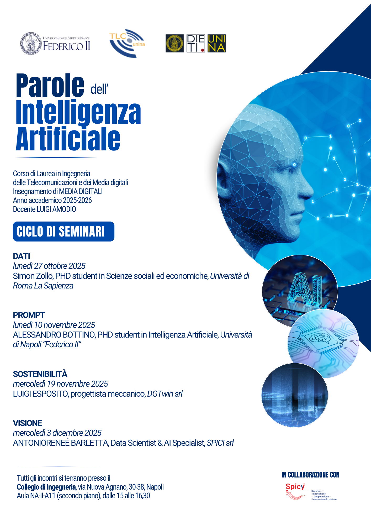 Lunedì 27 ottobre inizia il ciclo di seminari PAROLE DELL'INTELLIGENZA ARTIFICIALE: DATI, PROMPT, SOSTENIBILITA', VISIONE. Quattro incontri con giovani ricercatori e operatori del settore, nell'ambito dell'insegnamento di Media digitali, del prof. Luigi Amodio, nel CdL in Ingegneria delle TLC e dei Media digitali. Tutti gli incontri (27/10, 10/11, 19/11, 3/12) si tengono presso il polo universitario di Agnano dalle 15 alle 16,30 e sono ovviamente aperti a tutti gli studenti e le studentesse. Per info: Questo indirizzo email è protetto dagli spambots. È necessario abilitare JavaScript per vederlo.